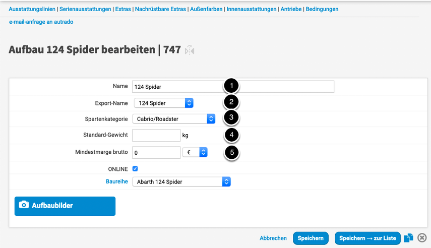 Sie können auf der Seite "Hersteller, Baureihen, Aufbauten" oder auf der Seite "Baureihe bearbeiten" neue Aufbauten anlegen und bearbeiten.