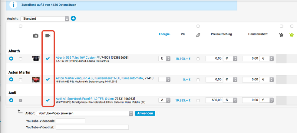 Um eine Video-Verlinkung vielen Fahrzeugen schnell gemeinsam zuzuweisen, rufen Sie auf der Bestandsliste die Aktion "YouTube-Video zuweisen" auf: