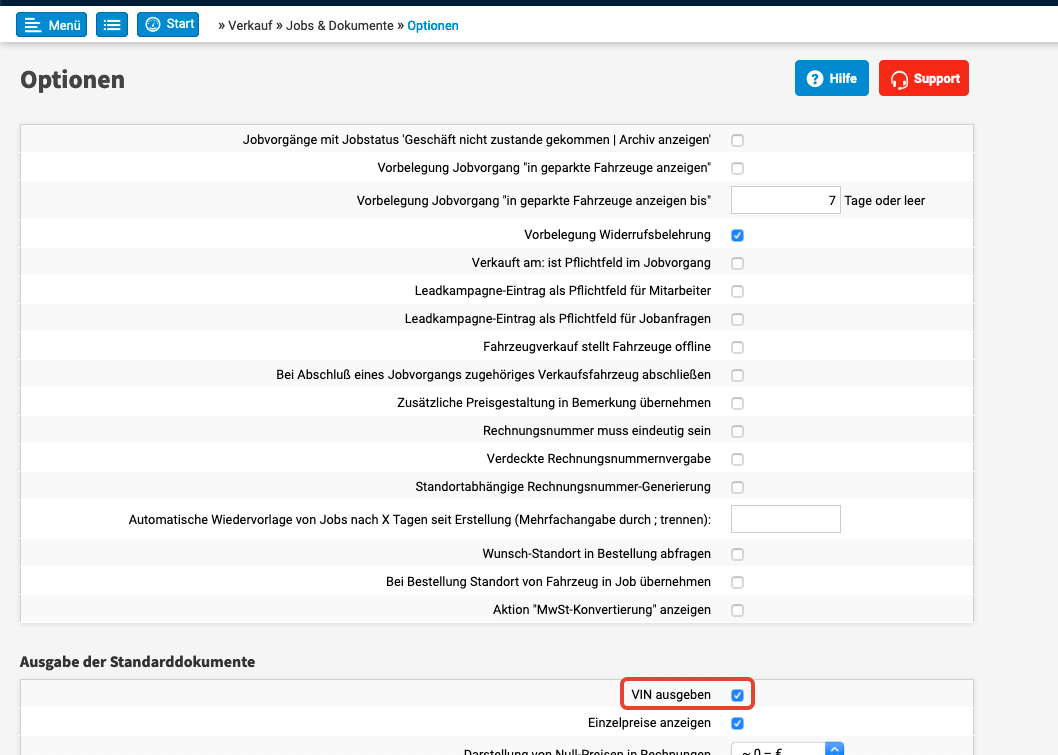 In den Optionen des Jobmanagers (Verkauf > Jobs & Dokumente > Optionen) legen Sie fest, ob die VIN in den Dokumenten ausgegeben werden soll: