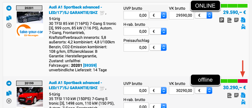 Ob ein Fahrzeug für Ihre Kunden sichtbar ist, hängt davon ab, ob sowohl der Hersteller, der Aufbau als auch das Fahrzeug online stehen (bei Lagerfahrzeugen muß zudem die Anzahl der Fahrzeuge größer als „0” sein). Um beide Zustände in Listenseiten zu erkennen, Farbbalken beachten (grün für ONLINE, rot für offline). Die Balken können geklickt und Aufbau oder Fahrzeuge in ihrem ONLINE-Zustand schnell umgestellt werden.