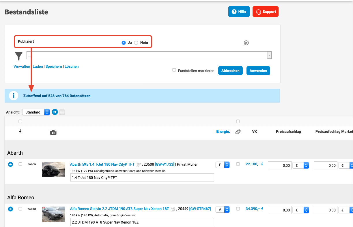 Sie können auf der Bestandsliste alle Fahrzeuge anzeigen (filtern), die nicht online sind: