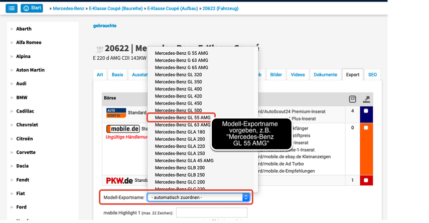 Bei Marken wie BMW und Mercedes-Benz ist es zum Auffinden in der Autobörse häufig notwendig, das genaue Modell anzugeben. Der Aufbau heisst ggf. "A-Klasse" oder "3er Limousine" und erzeugt damit den korrekten Menüpunkt auf Ihrer Website; aber wenn jemand in der Autobörse einen Mercedes-Benz "A 180" oder einen BMW "330i" finden möchte, ist der Export-Name des Aufbaus nicht genau genug.