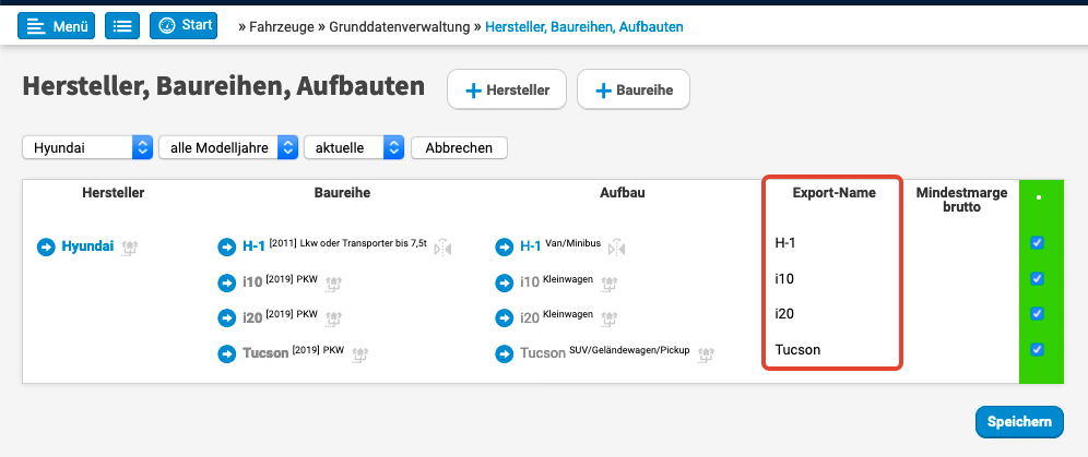 Damit die Fahrzeuge in den Autobörsen korrekt gefunden werden, vergeben Sie im Aufbau wenn möglich einen korrekten Export-Namen; in der Regel ist damit eine weitere Zuweisung nicht notwendig: bei den Fahrzeugen des Aufbaus steht der "Modell-Exportname" damit auf "automatisch zuordnen" und wird vom Aufbau übergeben: