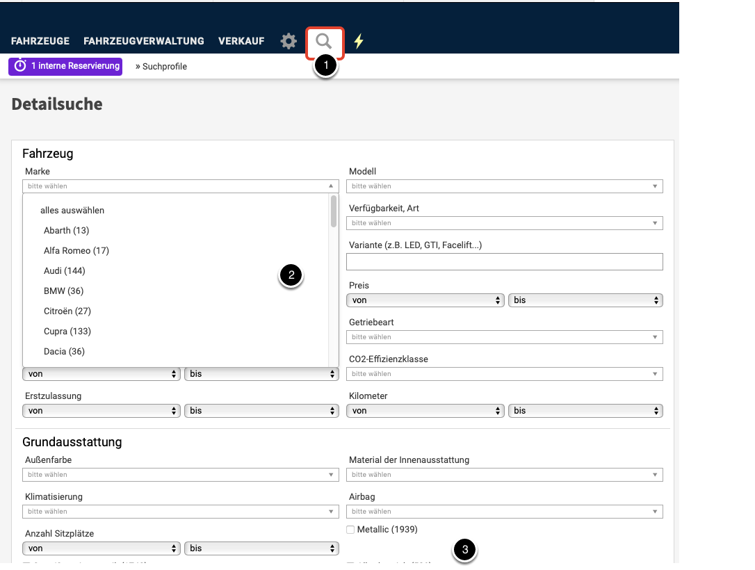Um Fahrzeuge mit vorgegebenen Eigenschaften zu finden, rufen Sie eine Ihrer Suchen auf, z.B. die Detailsuche: