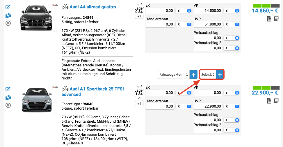 In der Ergebnisliste finden Sie die gesuchten Fahrzeuge; klicken Sie jetzt in das Job-Icon, um einen Job zu erstellen.
