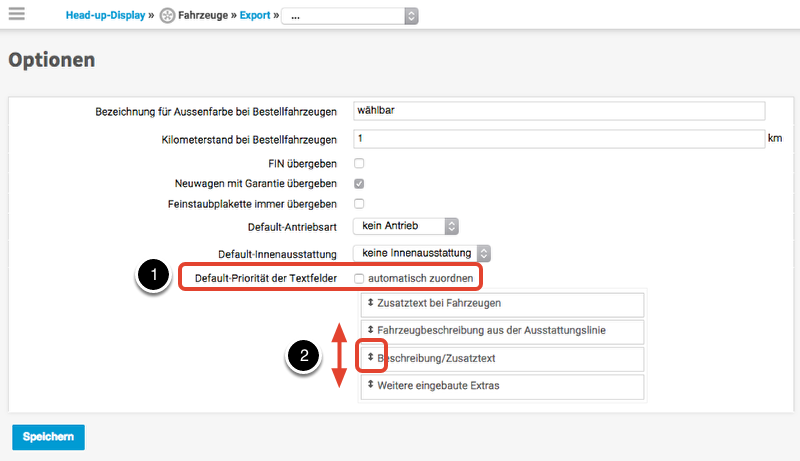 Bei den Exporten der Fahrzeuge an die Fahrzeugbörsen werden verschiedene Texte zu einem gemeinsamen Fahrzeugbeschreibungsfeld übergeben. Sie können genau vorgeben, in welcher Reihenfolge die Texte übergeben werden sollen. Auf diese Weise können Sie sicherstellen, dass die wichtigen Texte auch übergeben werden und dass ggf. eher unwichtige Texte gekürzt werden (wichtig beim Export von z.B. max. 4.000 Zeichen).