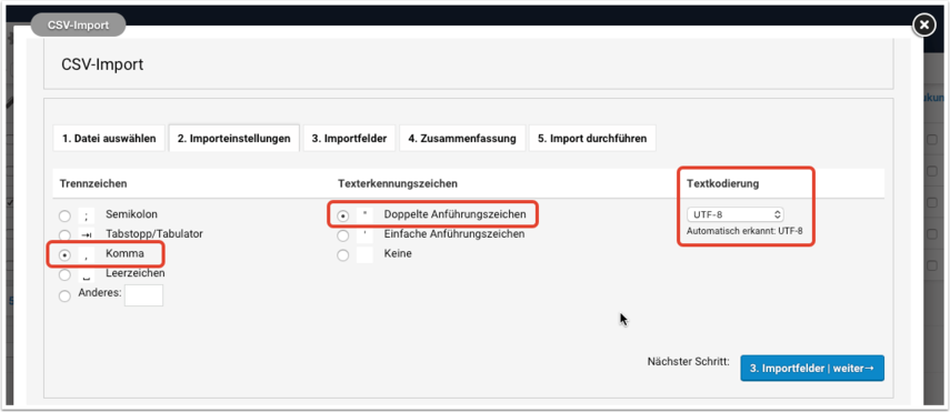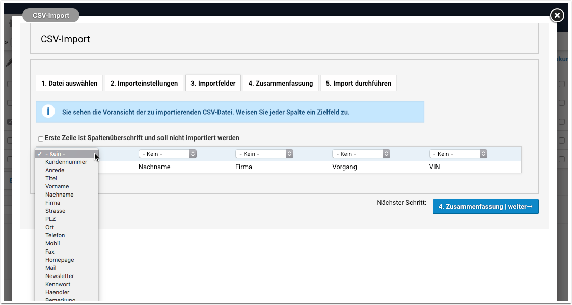 Achten Sie darauf, dass die Zuordnungen so vorgenommen werden, wie Sie die Datei aus Excel oder anderen Programmen abgespeichert haben; gehen Sie anschließend zum nächsten Schritt, um die Spalten zuzuweisen: