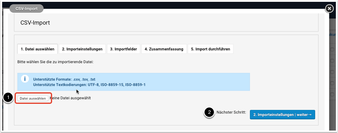 Klicken Sie auf den CSV-Import-Assistenten-Button, um Ihre Datei zu laden: