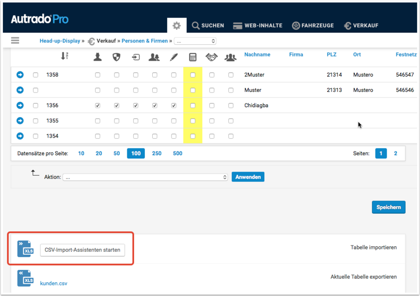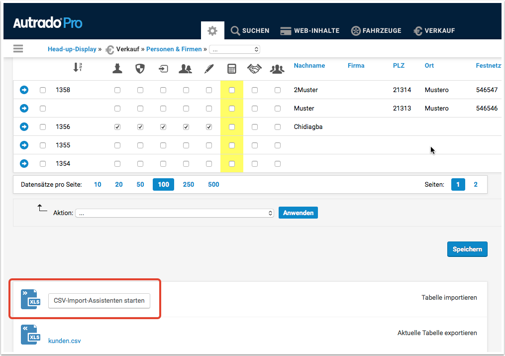 Um die externen Daten in Ihr Autrado-System zu übernehmen, rufen Sie "Verkauf > Personen & Firmen" auf und skrollen auf der Seite nach unten: